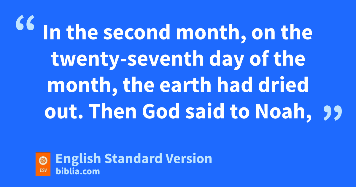 13 In the six hundred and first year, in the first month, the first day of the month, the waters were dried from off the earth. And Noah removed the covering of the ark and looked, and behold, the face of the ground was dry. 14 In the second month, on the twenty-seventh day of the month, the earth had dried out. 15 Then God said to Noah, 16 “Go out from the ark, iyou and your wife, and your sons and your sons’ wives with you. 17 Bring out with you every living thing that is with you of all flesh—birds and animals and every creeping thing that creeps on the earth—that they may swarm on the earth, and jbe fruitful and multiply on the earth.” 18 So Noah went out, and his sons and his wife and his sons’ wives with him. 19 Every beast, every creeping thing, and every bird, everything that moves on the earth, went out by families from the ark.