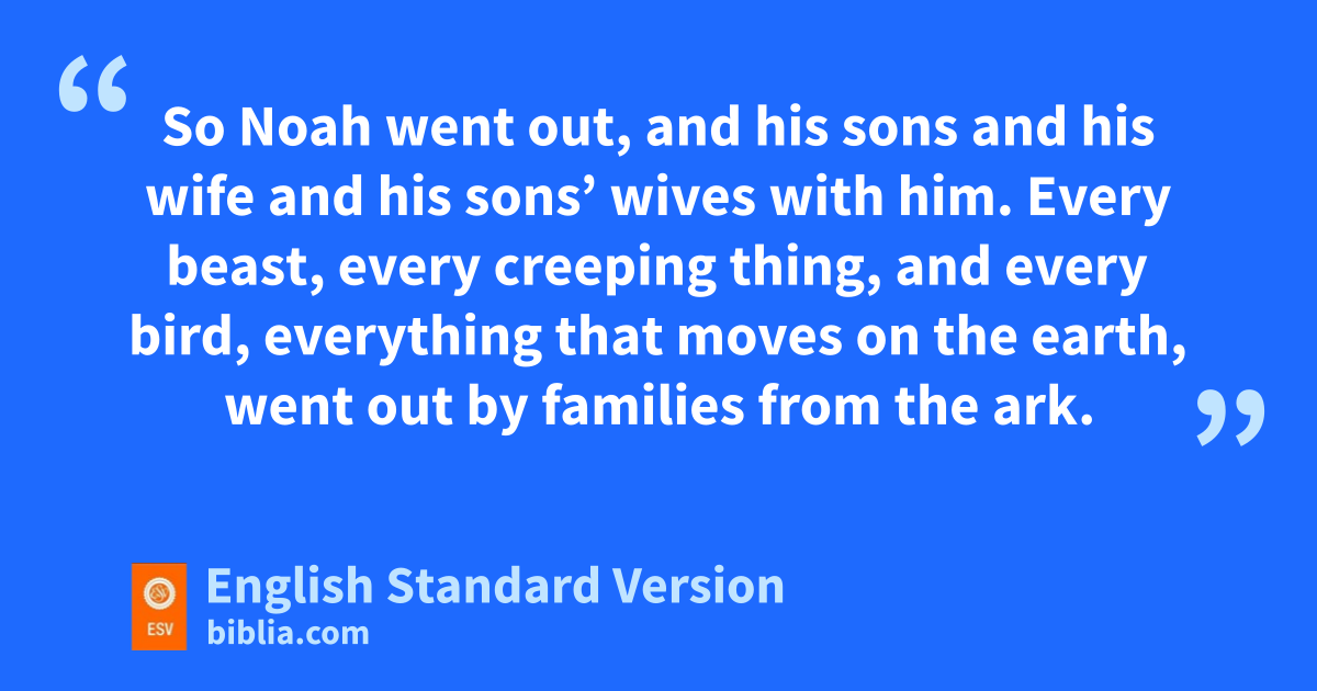 13 In the six hundred and first year, in the first month, the first day of the month, the waters were dried from off the earth. And Noah removed the covering of the ark and looked, and behold, the face of the ground was dry. 14 In the second month, on the twenty-seventh day of the month, the earth had dried out. 15 Then God said to Noah, 16 “Go out from the ark, iyou and your wife, and your sons and your sons’ wives with you. 17 Bring out with you every living thing that is with you of all flesh—birds and animals and every creeping thing that creeps on the earth—that they may swarm on the earth, and jbe fruitful and multiply on the earth.” 18 So Noah went out, and his sons and his wife and his sons’ wives with him. 19 Every beast, every creeping thing, and every bird, everything that moves on the earth, went out by families from the ark.
