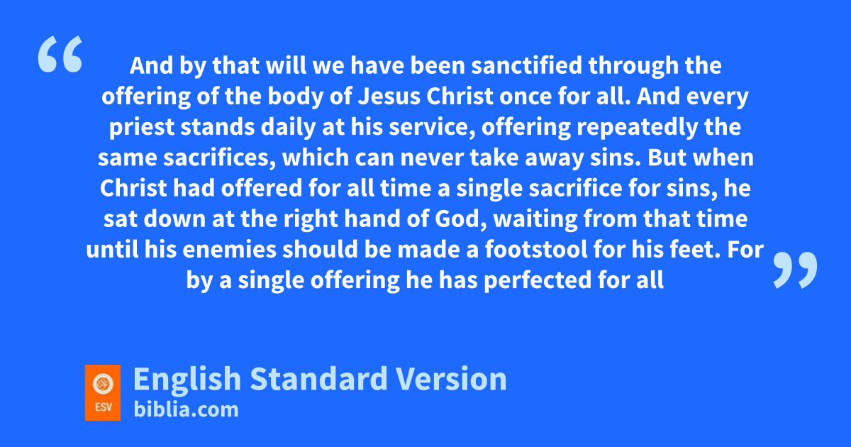 11 And every priest stands hdaily at his service, ioffering repeatedly the same sacrifices, jwhich can never take away sins. 12 But when Christ2 had offered for all time a single sacrifice for sins, he ksat down at the right hand of God, 13 waiting from that time luntil his enemies should be made a footstool for his feet. 14 For by a single offering mhe has perfected for all time those who are being sanctified.