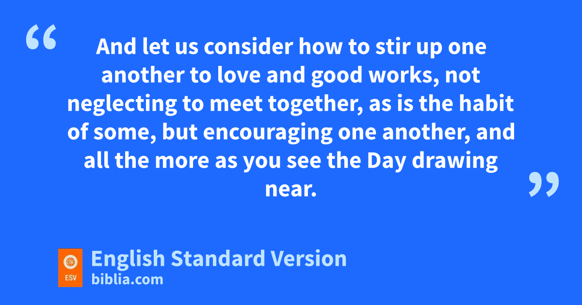 19 pTherefore, brothers,3 since we have confidence to enter qthe holy places by the blood of Jesus, 20 by rthe new and living way that he opened for us through sthe curtain, that is, through his flesh, 21 and since we have ta great priest over the house of God, 22 let us draw near with a true heart in full assurance of faith, with our hearts usprinkled clean vfrom an evil conscience and our bodies wwashed with pure water. 23 xLet us hold fast the confession of our hope without wavering, for yhe who promised is faithful. 24 And zlet us consider how to stir up one another to love and good works, 25 anot neglecting to meet together, as is the habit of some, but encouraging one another, and ball the more as you see cthe Day drawing near.