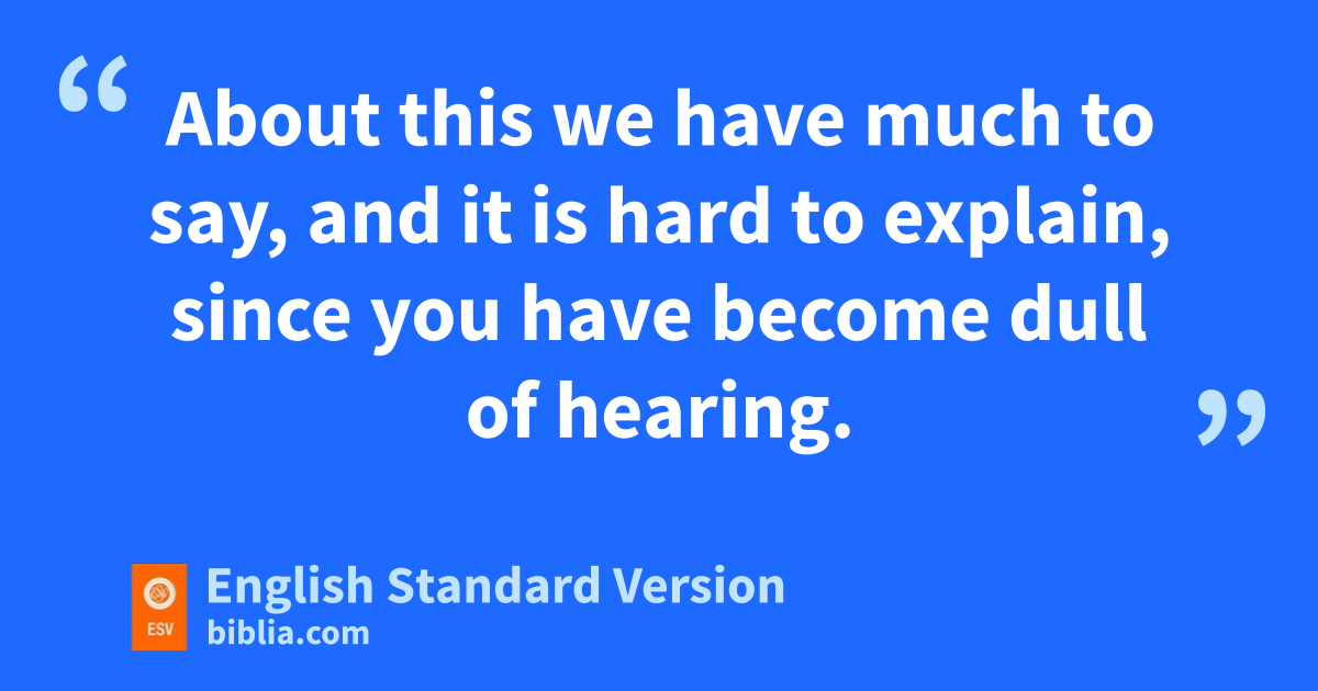 11 About this we have much to say, and it is chard to explain, since you have become dull of hearing. 12 For though by this time you ought to be teachers, you need someone to teach you again dthe basic principles of the oracles of God. You need emilk, not solid food, 13 for everyone who lives on milk is unskilled in the word of righteousness, since he is fa child. 14 But solid food is for gthe mature, for those who have their powers hof discernment trained by constant practice to distinguish good from evil.