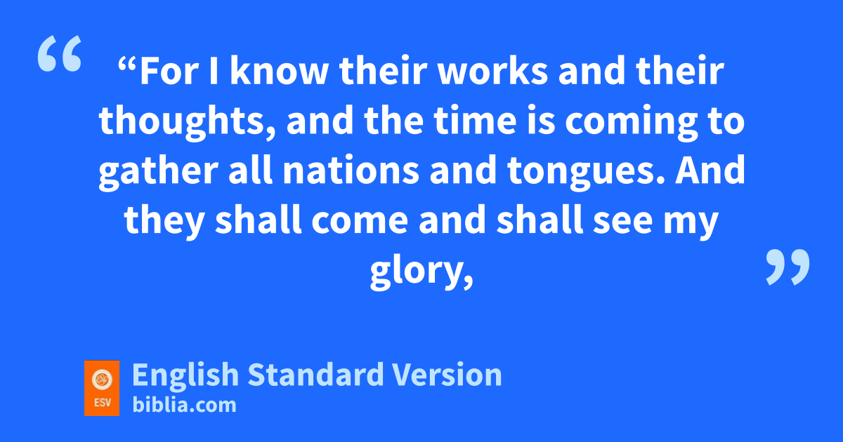 18 “For I know2 their works and their thoughts, and the time is coming3 ato gather all nations and tongues. And they shall come and shall see my glory, 19 and I will set a sign among them. And from them bI will send survivors to the nations, to cTarshish, dPul, and dLud, who draw the bow, to eTubal and eJavan, fto the coastlands far away, gthat have not heard my fame or seen my glory. And they shall declare my glory among the nations. 20 hAnd they shall bring all your brothers from all the nations ias an offering to the Lord, on horses and in chariots and in litters and on mules and on dromedaries, to my holy mountain Jerusalem, says the Lord, just as the Israelites bring their grain offering in a clean vessel to the house of the Lord. 21 jAnd some of them also I will take for priests and for Levites, says the Lord.