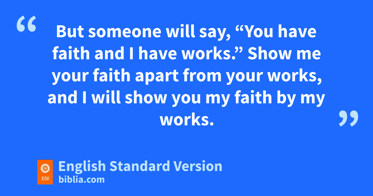 18 But someone will say, “You have faith and I have works.” Show me your faith rapart from your works, and I will show you my faith sby my works. 19 tYou believe that God is one; you do well. Even uthe demons believe—and shudder! 20 Do you want to be shown, you foolish person, that faith apart from works is useless? 21 vWas not Abraham our father justified by works when he offered up his son Isaac on the altar? 22 You see that wfaith was active along with his works, and faith was completed xby his works; 23 and the Scripture was fulfilled that says, y“Abraham believed God, and it was counted to him as righteousness”—and he was called a zfriend of God. 24 You see that a person is justified by works and not by faith alone. 25 And in the same way was not also aRahab the prostitute justified by works bwhen she received the messengers and sent them out by another way? 26 For as the body apart from the spirit is dead, so also faith apart from works is dead.