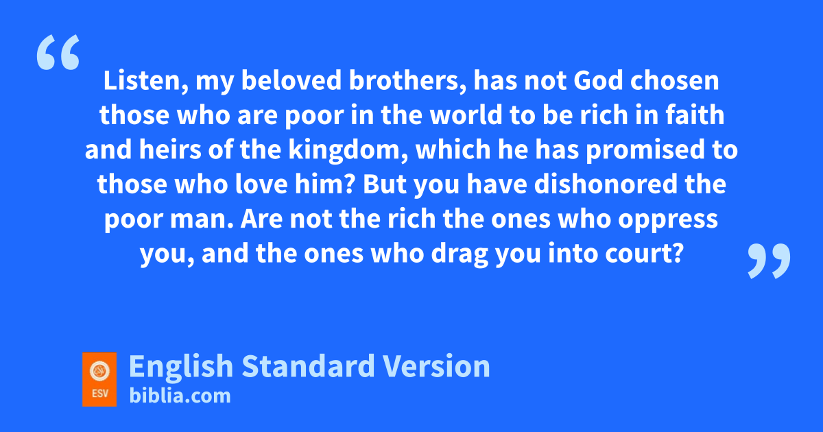 2 My brothers,1 wshow no partiality as you hold the faith in our Lord Jesus Christ, xthe Lord of glory. 2 For if a man wearing a gold ring and fine clothing comes into your assembly, and a poor man in shabby clothing also comes in, 3 and if you pay attention to the one who wears the fine clothing and say, “You sit here in a good place,” ywhile you say to the poor man, “You stand over there,” or, “Sit down at my feet,” 4 have you not then made distinctions among yourselves and become zjudges with evil thoughts? 5 Listen, my beloved brothers, ahas not God chosen those who are poor in the world to be brich in faith and heirs of cthe kingdom, dwhich he has promised to those who love him? 6 But you ehave dishonored the poor man. Are not the rich the ones who oppress you, and the ones who fdrag you ginto court? 7 Are they not the ones who blaspheme the honorable hname by which you were called?