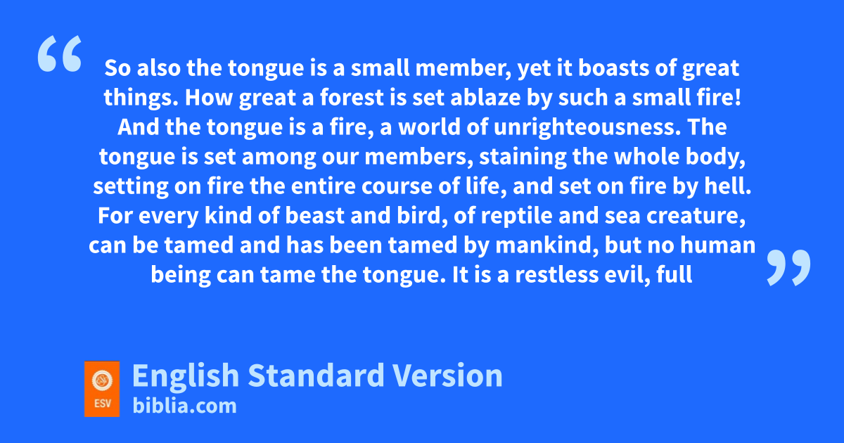 How great a forest is set ablaze by such a small fire! 6 And ithe tongue is a fire, a world of unrighteousness. The tongue is set among our members, jstaining the whole body, setting on fire the entire course of life,1 and set on fire by hell.2 7 For every kind of beast and bird, of reptile and sea creature, can be tamed and has been tamed by mankind, 8 but no human being can tame the tongue. It is a restless evil, kfull of deadly poison. 9 With it we bless our Lord and Father, and with it we curse people lwho are made in the likeness of God. 10 From the same mouth come blessing and cursing. My brothers,3 these things ought not to be so. 11 Does a spring pour forth from the same opening both fresh and salt water? 12 Can a fig tree, my brothers, bear olives, or a grapevine produce figs? Neither can a salt pond yield fresh water.