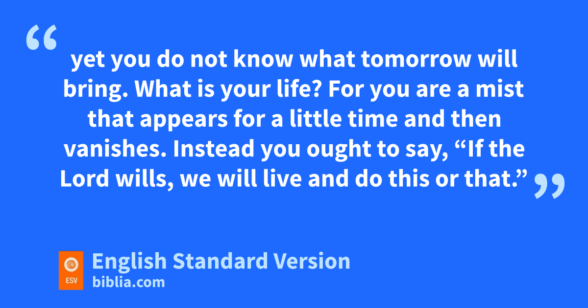 13 Come now, you who say, s“Today or tomorrow we will go into such and such a town and spend a year there and trade and make a profit”— 14 yet you do not know what tomorrow will bring. What is your life? For tyou are a mist that appears for a little time and then vanishes. 15 Instead you ought to say, u“If the Lord wills, we will live and do this or that.” 16 As it is, you boast in your arrogance. vAll such boasting is evil. 17 wSo whoever knows the right thing to do and fails to do it, for him it is sin.