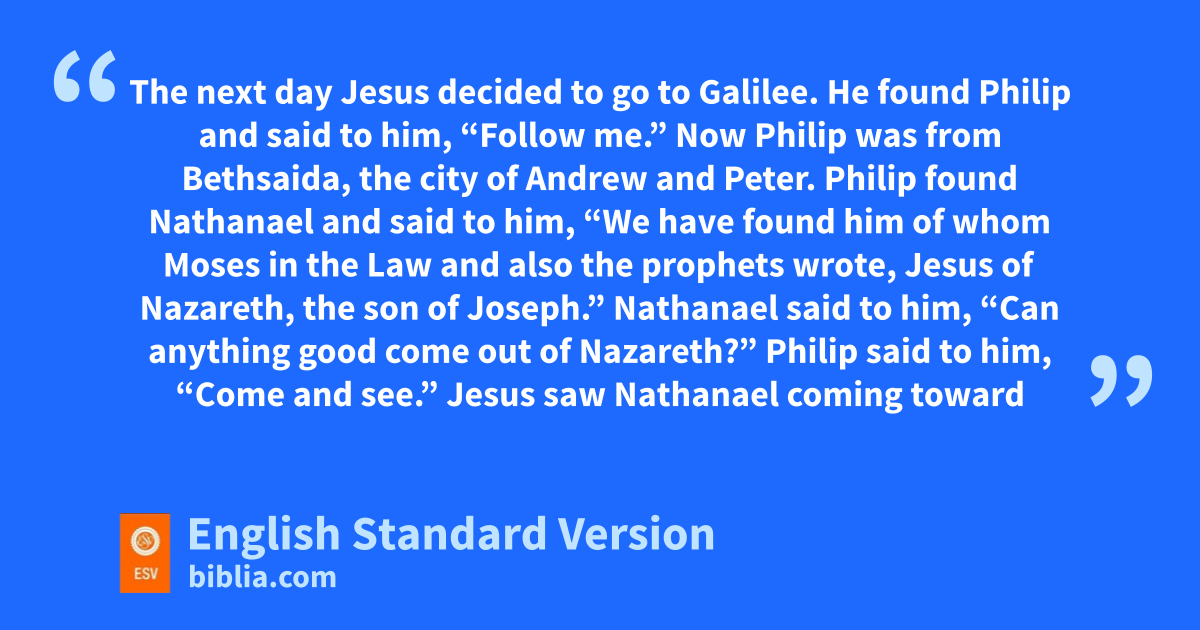 43 qThe next day Jesus decided rto go to Galilee. He found Philip and said to him, “Follow me.” 44 Now sPhilip was from Bethsaida, the city of Andrew and Peter. 45 Philip found tNathanael and said to him, “We have found him of whom uMoses in the Law and also the prophets wrote, Jesus vof Nazareth, wthe son of Joseph.” 46 Nathanael said to him, x“Can anything good come out of Nazareth?” Philip said to him, “Come and see.” 47 Jesus saw Nathanael coming toward him and said of him, “Behold, yan Israelite indeed, zin whom there is no deceit!” 48 Nathanael said to him, “How ado you know me?” Jesus answered him, “Before Philip called you, when you were under the fig tree, I saw you.” 49 Nathanael answered him, b“Rabbi, cyou are the Son of God! You are the dKing of Israel!” 50 Jesus answered him, “Because I said to you, ‘I saw you under the fig tree,’ do you believe? You will see greater things than these.” 51 And he said to him, “Truly, truly, I say to you,13 you will see eheaven opened, and fthe angels of God ascending and descending on gthe Son of Man.”