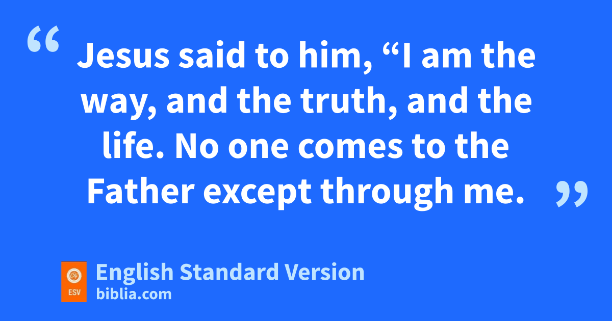 14 d“Let not your hearts be troubled. eBelieve in God;1 believe also in me. 2 In fmy Father’s house are many rooms. If it were not so, would I have told you that gI go to prepare a place for you?2 3 And if I go and prepare a place for you, I will come again and will take you hto myself, that iwhere I am you may be also. 4 And you know the way to where I am going.”3 5 jThomas said to him, “Lord, kwe do not know where you are going. How can we know the way?” 6 Jesus said to him, “I am lthe way, and mthe truth, and nthe life. No one comes to the Father except through me. 7 oIf you had known me, you would have pknown my Father also.4 From now on you do know him and qhave seen him.”