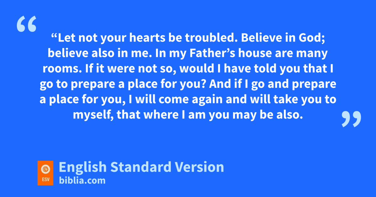14 d“Let not your hearts be troubled. eBelieve in God;1 believe also in me. 2 In fmy Father’s house are many rooms. If it were not so, would I have told you that gI go to prepare a place for you?2 3 And if I go and prepare a place for you, I will come again and will take you hto myself, that iwhere I am you may be also. 4 And you know the way to where I am going.”3 5 jThomas said to him, “Lord, kwe do not know where you are going. How can we know the way?” 6 Jesus said to him, “I am lthe way, and mthe truth, and nthe life. No one comes to the Father except through me. 7 oIf you had known me, you would have pknown my Father also.4 From now on you do know him and qhave seen him.”