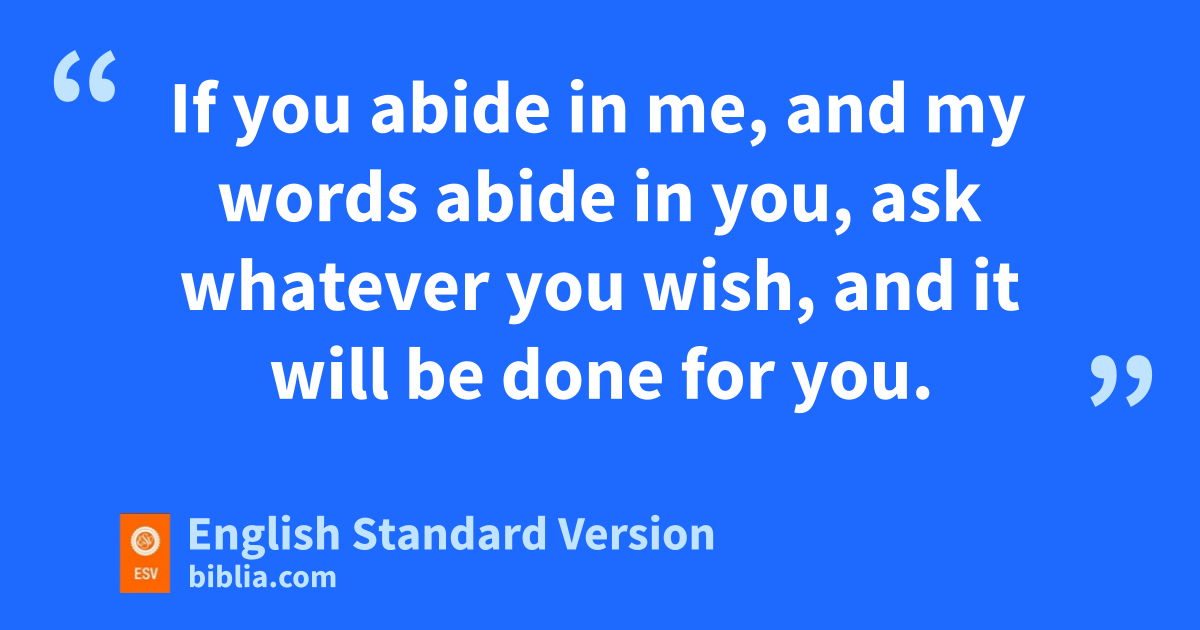 15 “I am the rtrue vine, and my Father is sthe vinedresser. 2 tEvery branch in me that does not bear fruit uhe takes away, and every branch that does bear fruit he prunes, vthat it may bear more fruit. 3 Already wyou are clean xbecause of the word that I have spoken to you. 4 yAbide zin me, and I in you. As the branch cannot bear fruit by itself, unless it abides in the vine, neither can you, unless you abide in me. 5 I am the vine; ayou are the branches. Whoever abides in me and I in him, he it is that bbears much fruit, for apart from me you can do nothing. 6 If anyone does not abide in me che is thrown away like a branch and withers; dand the branches are gathered, thrown into the fire, and burned. 7 If eyou abide in me, and my words abide in you, fask whatever you wish, and it will be done for you. 8 gBy this my Father is glorified, that you hbear much fruit and so prove to be my disciples. 9 iAs the Father has loved me, jso have I loved you. Abide in my love. 10 kIf you keep my commandments, you will abide in my love, just as lI have kept mmy Father’s commandments and abide in his love. 11 These things I have spoken to you, nthat my joy may be in you, and that oyour joy may be full.
