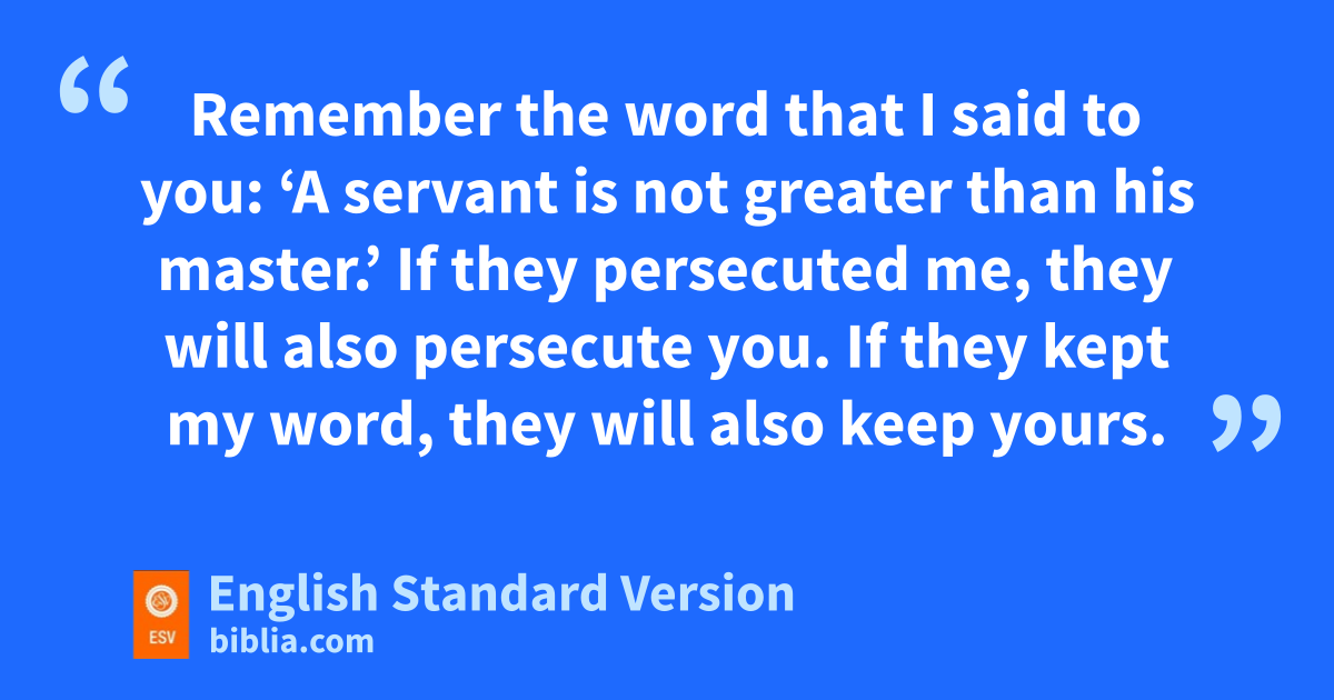 18 d“If the world hates you, know that it has hated me before it hated you. 19 eIf you were of the world, the world would love you as its own; but because fyou are not of the world, but I chose you out of the world, therefore the world hates you. 20 Remember the word that I said to you: g‘A servant is not greater than his master.’ If they persecuted me, hthey will also persecute you. iIf they kept my word, they will also keep yours. 21 But jall these things they will do to you kon account of my name, lbecause they do not know him who sent me. 22 If I had not come and spoken to them, mthey would not have been guilty of sin,3 but now they have no excuse for their sin. 23 nWhoever hates me hates my Father also. 24 oIf I had not done among them the works that no one else did, mthey would not be guilty of sin, but now they have pseen and hated both me and my Father. 25 But qthe word that is written in their Law must be fulfilled: r‘They hated me without a cause.’