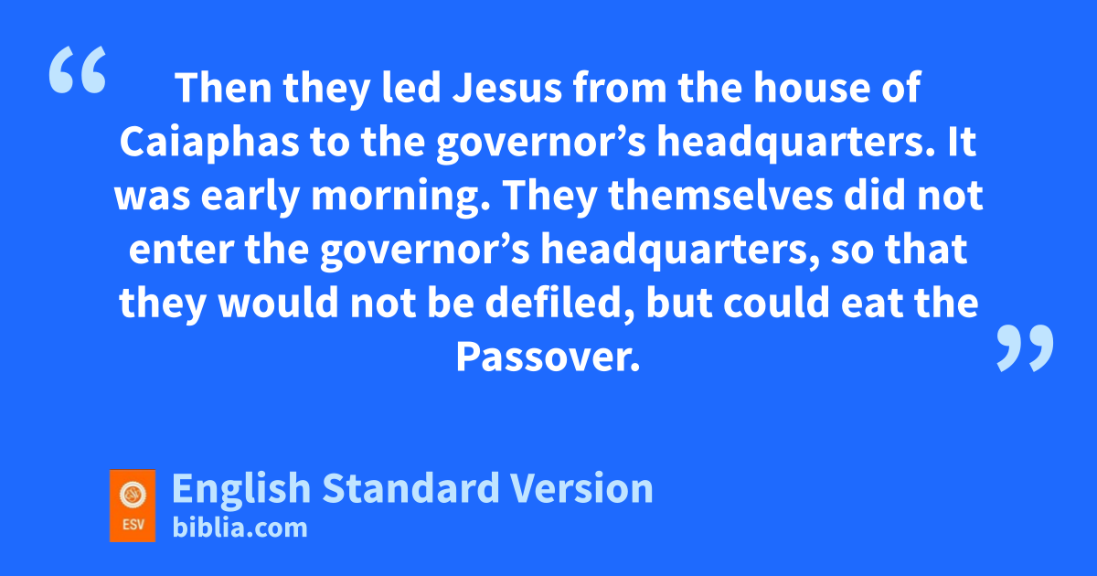 28 qThen they led Jesus rfrom the house of Caiaphas to sthe governor’s headquarters.6 It was early morning. They themselves did not enter the governor’s headquarters, tso that they would not be defiled, ubut could eat the Passover. 29 vSo Pilate went outside to them and said, “What accusation do you bring against this man?” 30 They answered him, “If this man were not doing evil, we would not have delivered him over to you.” 31 Pilate said to them, w“Take him yourselves and judge him by your own law.” The Jews said to him, “It is not lawful for us to put anyone to death.” 32 xThis was to fulfill the word that Jesus had spoken yto show by what kind of death he was going to die.