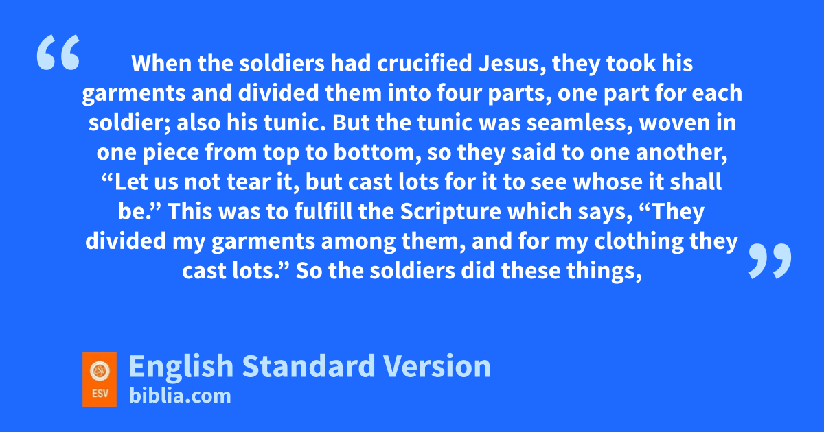 23 uWhen the soldiers had crucified Jesus, they took his garments and divided them into four parts, one part for each soldier; also his tunic.4 But the tunic was seamless, woven in one piece from top to bottom, 24 so they said to one another, “Let us not tear it, but cast lots for it to see whose it shall be.” vThis was to fulfill the Scripture which says,