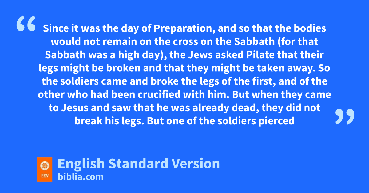 31 Since it was gthe day of Preparation, and hso that the bodies would not remain on the cross on the Sabbath (for that Sabbath was ia high day), the Jews asked Pilate that their legs might be broken and that they might be taken away. 32 So the soldiers came and broke the legs of the first, and of the other jwho had been crucified with him. 33 But when they came to Jesus and saw that he was already dead, they did not break his legs. 34 But one of the soldiers pierced his side with a spear, and at once there came out kblood and water. 35 lHe who saw it has borne witness—mhis testimony is true, and he knows that he is telling the truth—nthat you also may believe. 36 oFor these things took place that the Scripture might be fulfilled: p“Not one of his bones qwill be broken.” 37 And again another Scripture says, r“They will look on him whom they have pierced.”