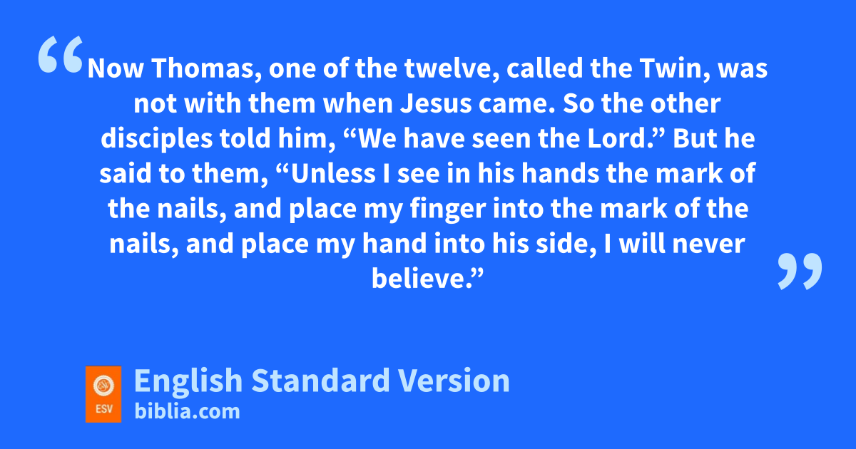 24 Now oThomas, one of the twelve, called the Twin,4 was not with them when Jesus came. 25 So the other disciples told him, “We have seen the Lord.” But he said to them, p“Unless I see in his hands the mark of the nails, and place my finger into the mark of the nails, and place my hand into his side, I will never believe.”