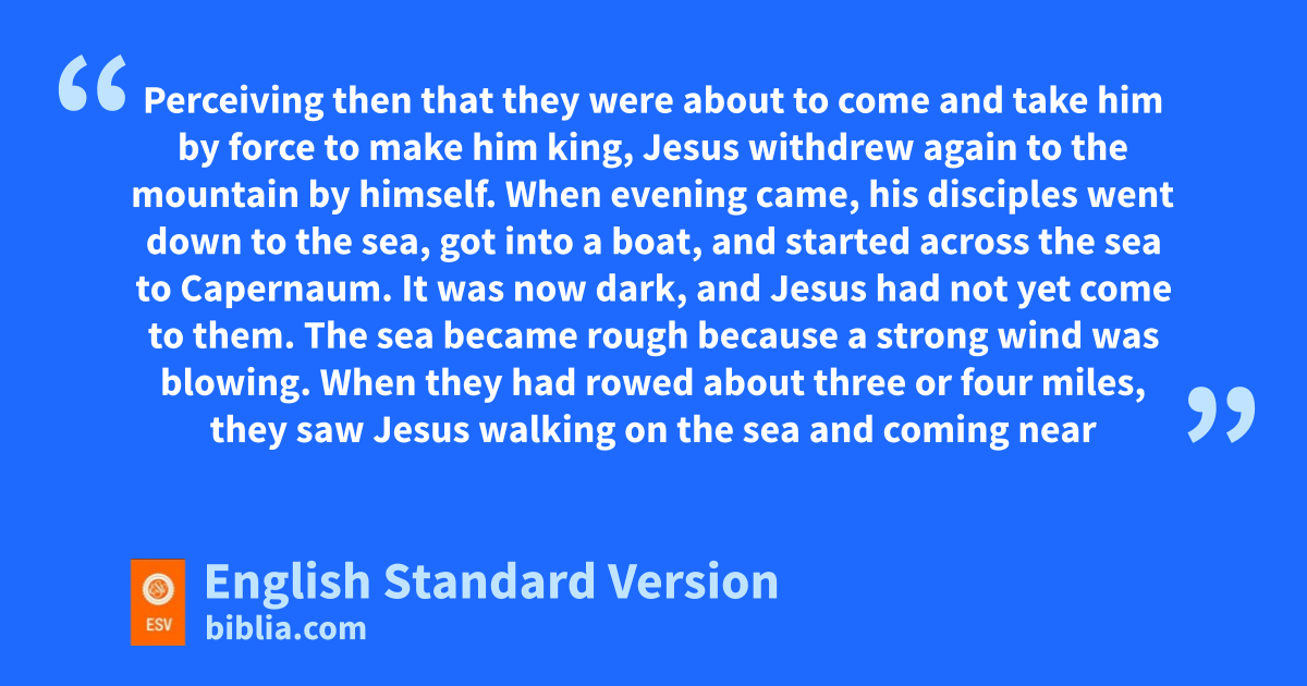 16 When evening came, his disciples went down to the sea, 17 got into a boat, and started across the sea to Capernaum. It was now dark, and Jesus had not yet come to them. 18 The sea became rough because a strong wind was blowing. 19 When they had rowed about three or four miles,2 they saw Jesus walking on the sea and coming near the boat, and they were frightened. 20 cBut he said to them, “It is I; do not be afraid.” 21 Then they were glad to take him into the boat, and immediately the boat was at the land to which they were going.