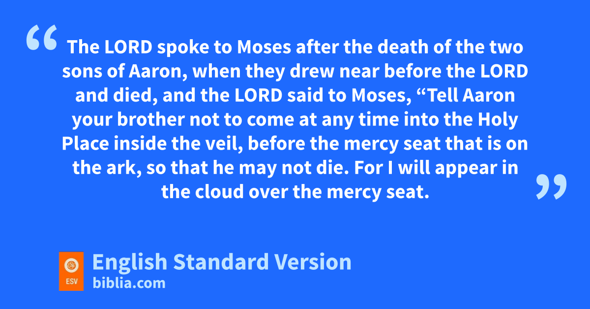 16 The Lord spoke to Moses after cthe death of the two sons of Aaron, when they drew near before the Lord and died, 2 and the Lord said to Moses, “Tell Aaron your brother not to dcome at any time into the Holy Place inside the veil, before the mercy seat that is on the ark, so that he may not die. For eI will appear in the cloud over the mercy seat. 3 But in this way Aaron shall come into the Holy Place: fwith a bull from the herd for a sin offering and ga ram for a burnt offering. 4 He shall put on hthe holy linen coat and shall have the linen undergarment on his body, and he shall tie the linen sash around his waist, and wear the linen turban; these are the holy garments. iHe shall bathe his body in water and then put them on. 5 And he shall take from jthe congregation of the people of Israel two male goats for a sin offering, and one ram for a burnt offering.