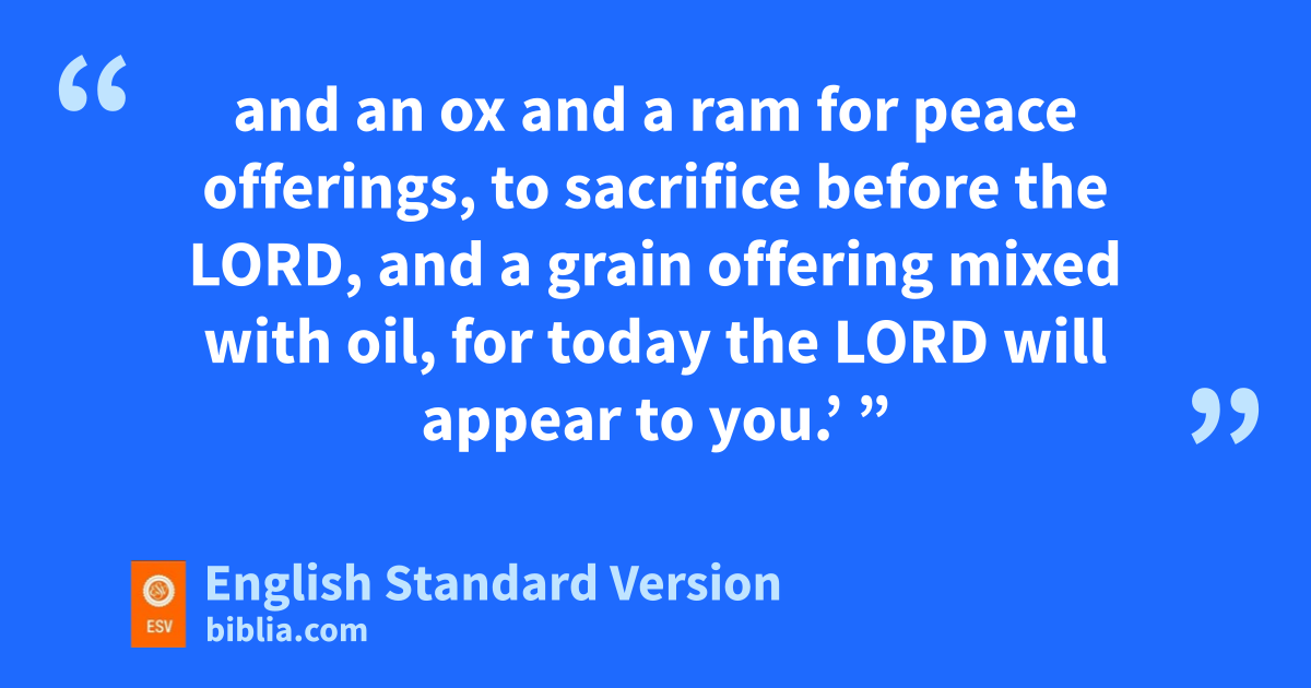 9 rOn the eighth day Moses called Aaron and his sons and the elders of Israel, 2 and he said to Aaron, s“Take for yourself a bull calf for a sin offering and ta ram for a burnt offering, both without blemish, and offer them before the Lord. 3 And say to the people of Israel, u‘Take a male goat for a sin offering, and a calf and a lamb, both a year old without blemish, for a burnt offering, 4 and an ox and a ram for peace offerings, to sacrifice before the Lord, and va grain offering mixed with oil, for wtoday the Lord will appear to you.’ ” 5 And they brought what Moses commanded in front of the tent of meeting, and all the congregation drew near and stood before the Lord. 6 And Moses said, “This is the thing that the Lord commanded you to do, that the glory of the Lord may appear to you.” 7 Then Moses said to Aaron, “Draw near to the altar and xoffer your sin offering and your burnt offering and ymake atonement for yourself and for the people, and bring the offering of the people and make atonement for them, as the Lord has commanded.”