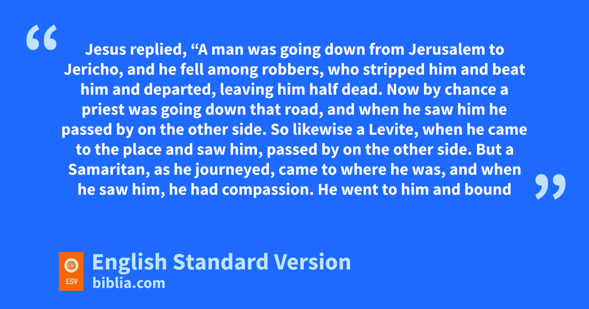 29 But he, vdesiring to justify himself, said to Jesus, “And who is my neighbor?” 30 Jesus replied, “A man wwas going down from Jerusalem to Jericho, and he fell among robbers, who stripped him and beat him and departed, leaving him half dead. 31 Now by chance a xpriest was going down that road, and when he saw him he passed by on the other side. 32 So likewise xa Levite, when he came to the place and saw him, passed by on the other side. 33 But a ySamaritan, as he journeyed, came to where he was, and when he saw him, he had compassion. 34 He went to him and zbound up his wounds, pouring on zoil and wine. Then he set him on his own animal and brought him to an inn and took care of him. 35 And the next day he took out two adenarii3 and gave them to the innkeeper, saying, ‘Take care of him, and whatever more you spend, I will repay you when I come back.’ 36 Which of these three, do you think, proved to be a neighbor to the man who fell among the robbers?” 37 He said, “The one who showed him mercy.” And Jesus said to him, “You go, and do likewise.”
