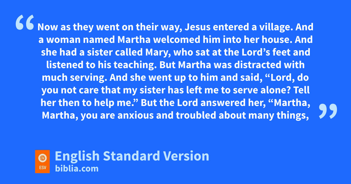 38 Now as they went on their way, Jesus4 entered a village. And a woman named bMartha cwelcomed him into her house. 39 And she had a sister called bMary, who dsat at the Lord’s feet and listened to his teaching. 40 But Martha was distracted with much serving. And she went up to him and said, “Lord, do you not care that my sister has left me to serve alone? Tell her then to help me.” 41 But the Lord answered her, “Martha, Martha, you are eanxious and troubled about many things, 42 but one thing is necessary.5 Mary has chosen fthe good portion, which will not be taken away from her.”