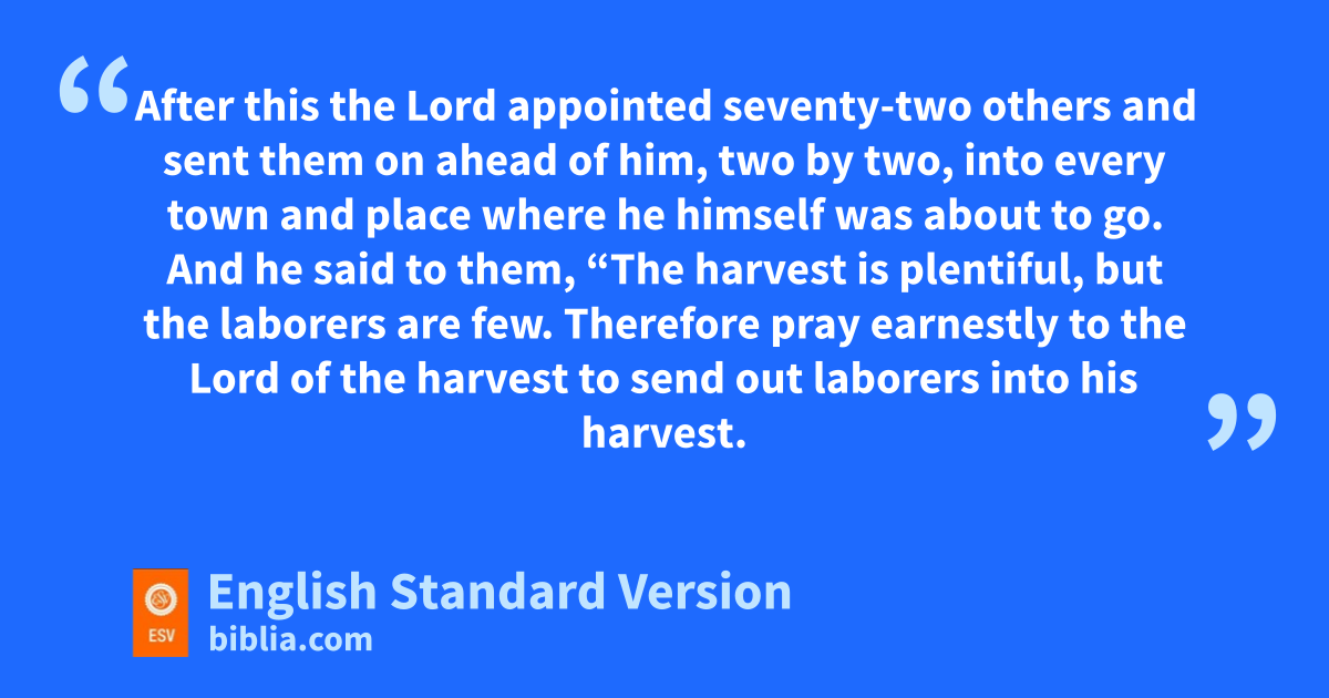 10 After this the Lord appointed xseventy-two1 others and ysent them on ahead of him, two by two, into every town and place where he himself was about to go. 2 zAnd he said to them, “The harvest is plentiful, but the laborers are few. aTherefore pray earnestly to the Lord of the harvest to send out laborers into his harvest. 3 Go your way; bbehold, I am sending you out as lambs in the midst of wolves. 4 cCarry no moneybag, no knapsack, no sandals, and dgreet no one on the road. 5 Whatever house you enter, first say, e‘Peace be to this house!’ 6 And if a son of peace is there, your peace will rest upon him. But if not, fit will return to you. 7 And remain in the same house, eating and drinking what they provide, for gthe laborer deserves his wages. Do not go from house to house. 8 Whenever you enter a town and they receive you, eat what is set before you. 9 Heal the sick in it and say to them, h‘The kingdom of God has come near to you.’ 10 But whenever you enter a town and they do not receive you, go into its streets and say, 11 i‘Even the dust of your town that clings to our feet we wipe off against you. Nevertheless know this, that jthe kingdom of God has come near.’ 12 I tell you, kit will be more bearable on lthat day for Sodom than for that town.
