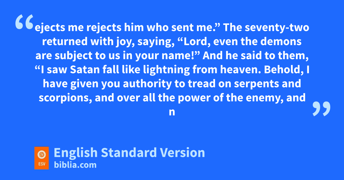 17 uThe seventy-two returned with joy, saying, “Lord, veven the demons are subject to us in your name!” 18 And he said to them, w“I saw Satan xfall like lightning from heaven. 19 Behold, I have given you authority yto tread on serpents and scorpions, and over all the power of zthe enemy, and anothing shall hurt you. 20 bNevertheless, do not rejoice in this, that the spirits are subject to you, but rejoice that cyour names are written in heaven.”