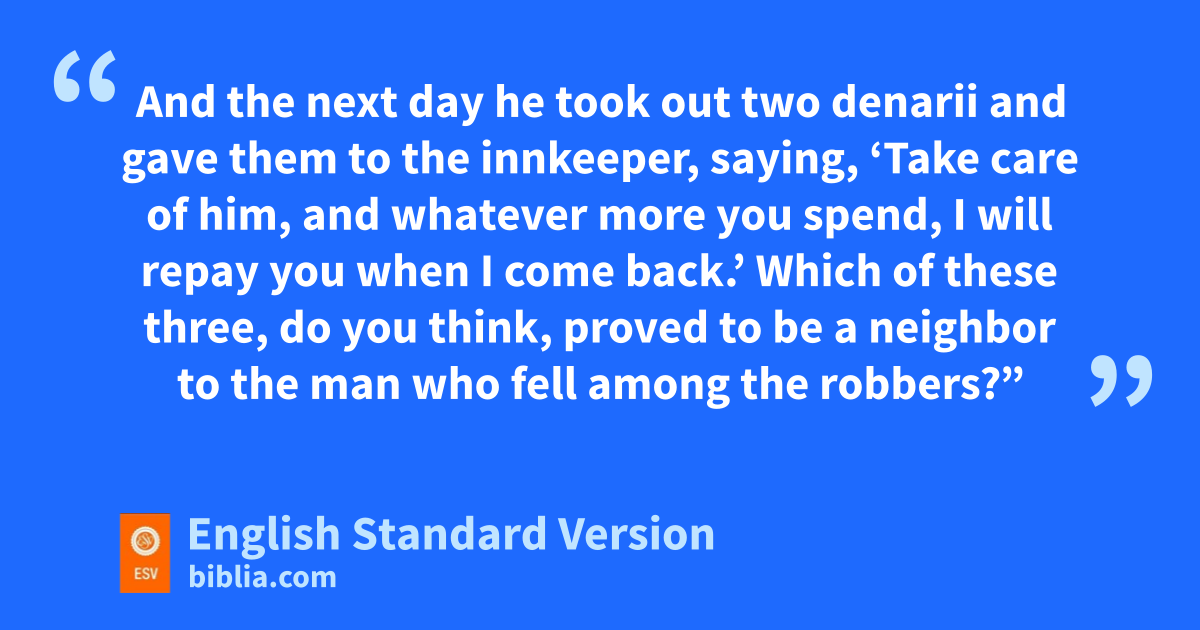 29 But he, vdesiring to justify himself, said to Jesus, “And who is my neighbor?” 30 Jesus replied, “A man wwas going down from Jerusalem to Jericho, and he fell among robbers, who stripped him and beat him and departed, leaving him half dead. 31 Now by chance a xpriest was going down that road, and when he saw him he passed by on the other side. 32 So likewise xa Levite, when he came to the place and saw him, passed by on the other side. 33 But a ySamaritan, as he journeyed, came to where he was, and when he saw him, he had compassion. 34 He went to him and zbound up his wounds, pouring on zoil and wine. Then he set him on his own animal and brought him to an inn and took care of him. 35 And the next day he took out two adenarii3 and gave them to the innkeeper, saying, ‘Take care of him, and whatever more you spend, I will repay you when I come back.’ 36 Which of these three, do you think, proved to be a neighbor to the man who fell among the robbers?” 37 He said, “The one who showed him mercy.” And Jesus said to him, “You go, and do likewise.”