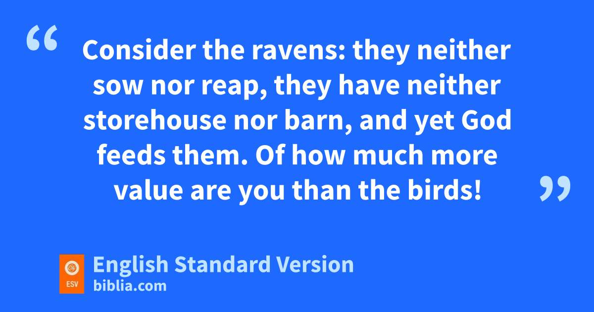 22 And he said to his disciples, f“Therefore I tell you, gdo not be anxious about your life, what you will eat, nor about your body, what you will put on. 23 For life is more than food, and the body more than clothing. 24 hConsider the ravens: they neither sow nor reap, they have neither storehouse nor barn, and yet God feeds them. iOf how much more value are you than the birds! 25 And which of you by being anxious can add a single hour to his jspan of life?3 26 If then you are not able to do as small a thing as that, why are you anxious about the rest? 27 Consider the lilies, how they grow: they neither toil nor spin, yet I tell you, keven Solomon in all his glory was not arrayed like one of these. 28 But if God so clothes the grass, which is alive in the field today, and tomorrow is thrown into the oven, how much more will he clothe you, lO you of little faith! 29 And do not seek what you are to eat and what you are to drink, nor mbe worried. 30 For nall the nations of the world seek after these things, and nyour Father knows that you need them. 31 Instead, oseek phis4 kingdom, qand these things will be added to you.