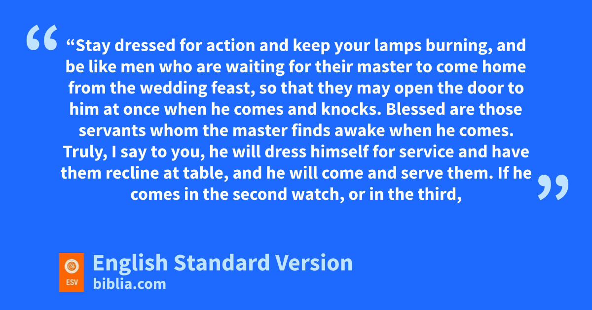 35 a“Stay dressed for action5 and bkeep your lamps burning, 36 and be like men who are cwaiting for their master to come home from the wedding feast, so that they may open the door to him at once when he comes and dknocks. 37 eBlessed are those servants6 whom the master finds eawake when he comes. Truly, I say to you, fhe will dress himself for service and ghave them recline at table, and he will come and serve them. 38 If he comes in the second watch, or in the third, and finds them awake, blessed are those servants! 39 hBut know this, that if the master of the house had known at what hour ithe thief was coming, he7 would not have left his house to be broken into. 40 You also must be jready, for kthe Son of Man is coming at an hour you do not expect.”