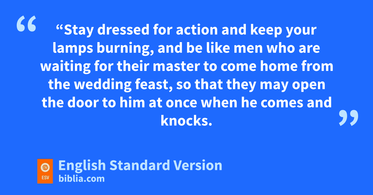 35 a“Stay dressed for action5 and bkeep your lamps burning, 36 and be like men who are cwaiting for their master to come home from the wedding feast, so that they may open the door to him at once when he comes and dknocks. 37 eBlessed are those servants6 whom the master finds eawake when he comes. Truly, I say to you, fhe will dress himself for service and ghave them recline at table, and he will come and serve them. 38 If he comes in the second watch, or in the third, and finds them awake, blessed are those servants! 39 hBut know this, that if the master of the house had known at what hour ithe thief was coming, he7 would not have left his house to be broken into. 40 You also must be jready, for kthe Son of Man is coming at an hour you do not expect.”