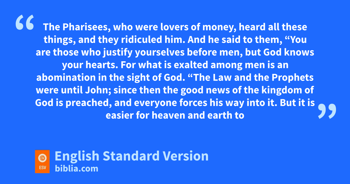 14 tThe Pharisees, who were ulovers of money, heard all these things, and they vridiculed him. 15 And he said to them, “You are those who wjustify yourselves before men, but xGod knows your hearts. For what is exalted among men yis an abomination in the sight of God.