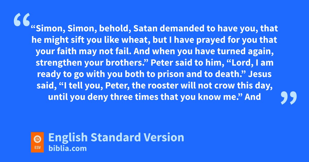 31 “Simon, Simon, behold, bSatan demanded to have you,4 cthat he might sift you like wheat, 32 but dI have prayed for you that your faith may not fail. And when you have turned again, estrengthen your brothers.” 33 Peter5 said to him, “Lord, I am ready to go with you both fto prison and gto death.” 34 hJesus6 said, “I tell you, Peter, the rooster will not crow this day, until you deny three times that you know me.”