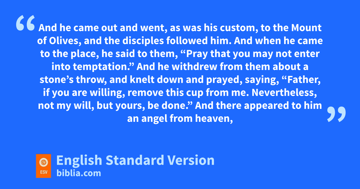 39 oAnd he came out and went, pas was his custom, to qthe Mount of Olives, and the disciples followed him. 40 rAnd when he came to sthe place, he said to them, t“Pray that you may not uenter into temptation.” 41 And he withdrew from them about a stone’s throw, and vknelt down and prayed, 42 saying, w“Father, if you are willing, remove xthis cup from me. yNevertheless, not my will, but yours, be done.” 43 And there appeared to him zan angel from heaven, strengthening him. 44 And wbeing in agony he prayed more earnestly; and his sweat became like great drops of blood falling down to the ground.7 45 And when he rose from prayer, he came to the disciples and found them sleeping for sorrow, 46 and he said to them, “Why are you sleeping? Rise and apray that you may not enter into temptation.”