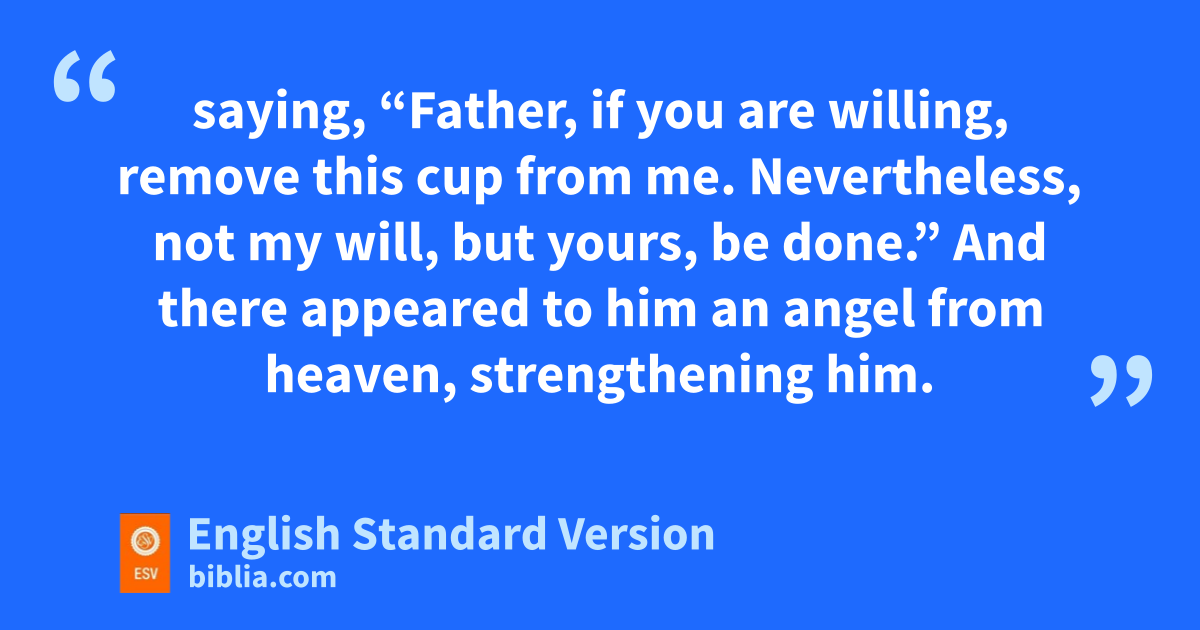 39 oAnd he came out and went, pas was his custom, to qthe Mount of Olives, and the disciples followed him. 40 rAnd when he came to sthe place, he said to them, t“Pray that you may not uenter into temptation.” 41 And he withdrew from them about a stone’s throw, and vknelt down and prayed, 42 saying, w“Father, if you are willing, remove xthis cup from me. yNevertheless, not my will, but yours, be done.” 43 And there appeared to him zan angel from heaven, strengthening him. 44 And wbeing in agony he prayed more earnestly; and his sweat became like great drops of blood falling down to the ground.7 45 And when he rose from prayer, he came to the disciples and found them sleeping for sorrow, 46 and he said to them, “Why are you sleeping? Rise and apray that you may not enter into temptation.”