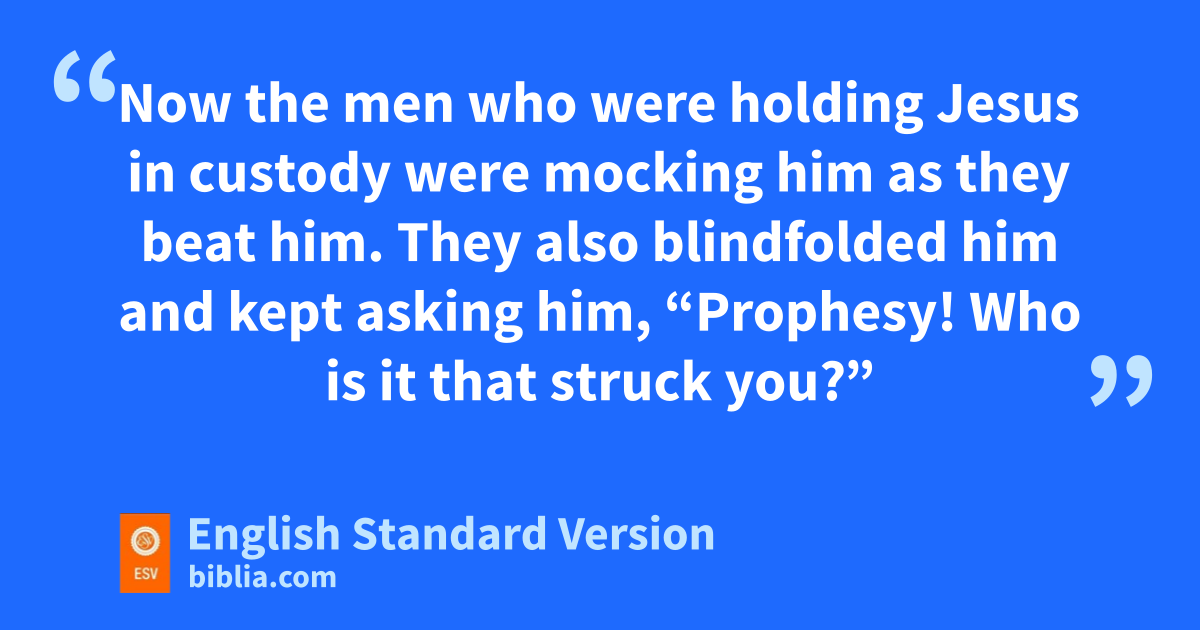 63 qNow the men who were holding Jesus in custody were mocking him as they beat him. 64 qThey also blindfolded him and kept asking him, r“Prophesy! rWho is it that struck you?” 65 And they said many other things against him, sblaspheming him.