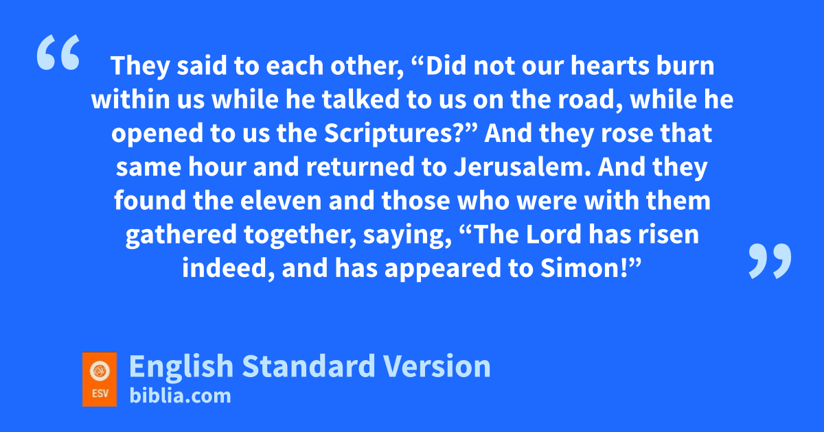 28 So they drew near to the village to which they were going. qHe acted as if he were going farther, 29 but they urged him strongly, saying, “Stay with us, for it is toward evening and rthe day is now far spent.” So he went in to stay with them. 30 When he was at table with them, he took the bread and sblessed and broke it and gave it to them. 31 tAnd their eyes were opened, and they recognized him. And uhe vanished from their sight. 32 They said to each other, v“Did not our hearts burn within us while he talked to us on the road, while he wopened to us the Scriptures?” 33 And they rose that same hour and returned to Jerusalem. And they xfound the eleven and ythose who were with them gathered together, 34 saying, “The Lord has risen indeed, and zhas appeared to Simon!” 35 Then they told what had happened on the road, and ahow he was known to them in bthe breaking of the bread.