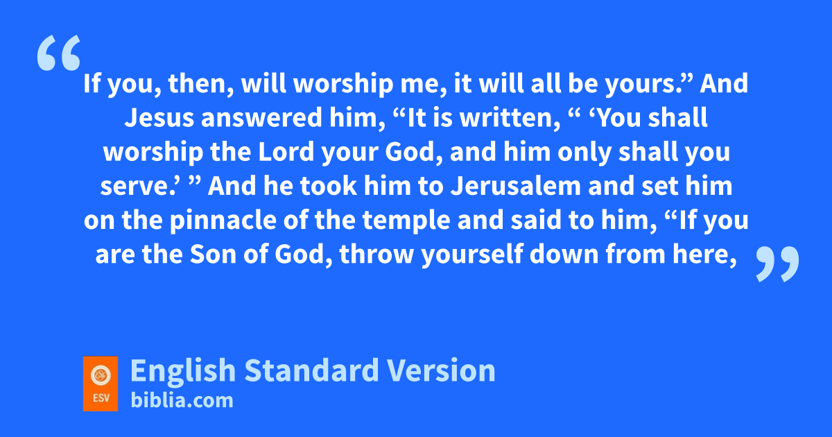 4 sAnd Jesus, tfull of the Holy Spirit, ureturned from the Jordan and was led vby the Spirit in the wilderness 2 for wforty days, xbeing tempted by the devil. wAnd he ate nothing during those days. And when they were ended, yhe was hungry. 3 The devil said to him, “If you are zthe Son of God, command athis stone to become bread.” 4 And Jesus answered him, b“It is written, c‘Man shall not live by bread alone.’ ” 5 dAnd the devil took him up and showed him all the kingdoms of the world in a moment of time, 6 and said to him, “To you eI will give all this authority and their glory, efor it has been delivered to me, and I give it to whom I will. 7 If you, then, will worship me, it will all be yours.” 8 And Jesus answered him, f“It is written,