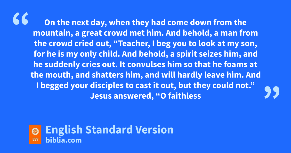 37 qOn the next day, when they had come down from the mountain, a great crowd met him. 38 And behold, a man from the crowd cried out, “Teacher, I beg you to look at my son, for rhe is my only child. 39 And behold, a spirit seizes him, and he suddenly cries out. It convulses him so that he foams at the mouth, and shatters him, and will hardly leave him. 40 And I begged your disciples to cast it out, but sthey could not.” 41 Jesus answered, “O tfaithless and twisted generation, uhow long am I to be with you and bear with you? Bring your son here.” 42 While he was coming, the demon threw him to the ground and convulsed him. But Jesus vrebuked the unclean spirit and healed the boy, and wgave him back to his father. 43 And all were astonished at xthe majesty of God.