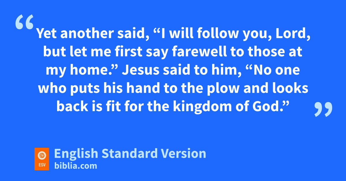 57 As they were going ralong the road, ssomeone said to him, “I will follow you wherever you go.” 58 And Jesus said to him, “Foxes have holes, and birds of the air have nests, but the Son of Man has nowhere to lay his head.” 59 To another he said, “Follow me.” But he said, “Lord, let me first go and bury my father.” 60 And Jesus7 said to him, “Leave tthe dead to bury their own dead. But as for you, go and uproclaim the kingdom of God.” 61 Yet another said, “I will follow you, Lord, vbut let me first say farewell to those at my home.” 62 Jesus said to him, w“No one who puts his hand to the plow and looks back is fit for the kingdom of God.”
