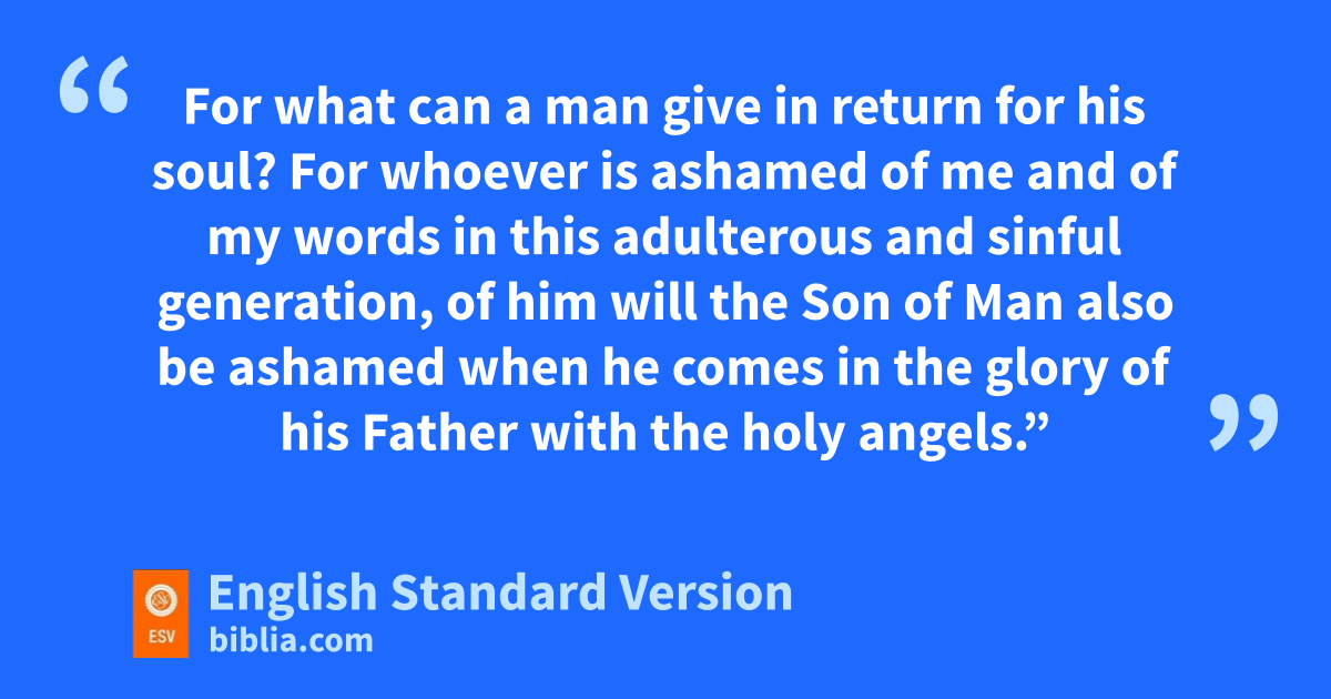 34 And calling the crowd to him with his disciples, he said to them, “If anyone would come after me, let him cdeny himself and dtake up his cross and follow me. 35 For dwhoever would save his life4 will lose it, but whoever loses his life for my sake eand the gospel’s will save it. 36 fFor what does it profit a man to gain the whole world and forfeit his soul? 37 For gwhat can a man give in return for his soul? 38 For hwhoever is ashamed of me and of my words in this iadulterous and sinful generation, of him will the Son of Man also be ashamed jwhen he comes in the glory of his Father with kthe holy angels.”