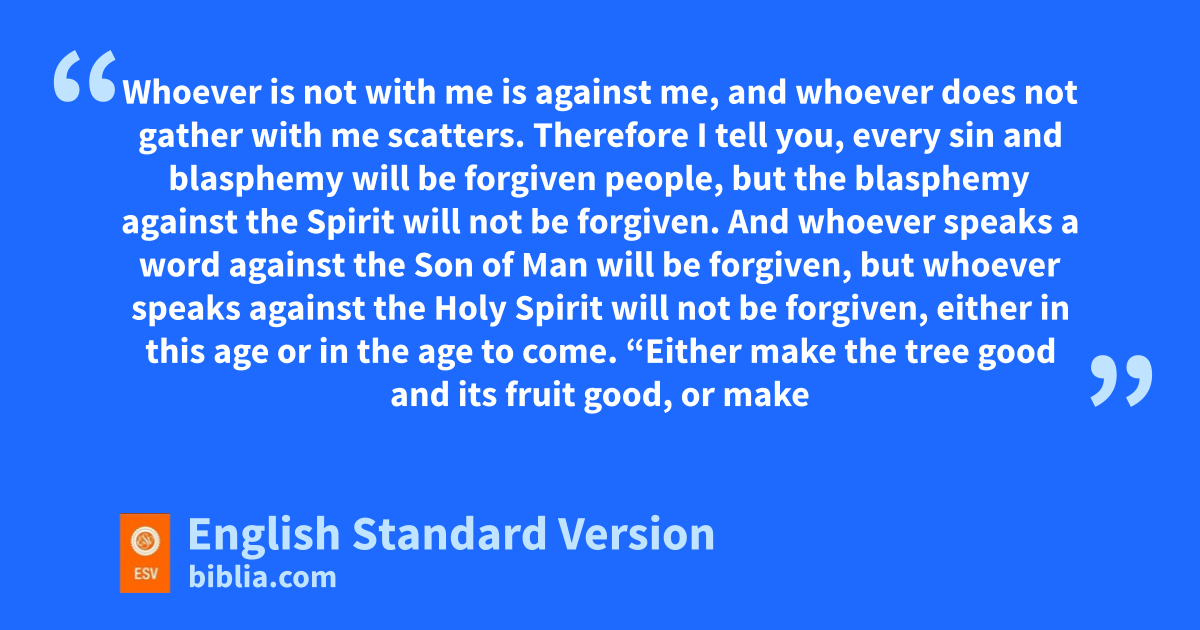 22 wThen a demon-oppressed man who was blind and mute was brought to him, and he healed him, so that the man spoke and saw. 23 xAnd all the people were amazed, and said, x“Can this be the Son of David?” 24 But when the Pharisees heard it, they said, y“It is only by Beelzebul, the prince of demons, that this man casts out demons.” 25 zKnowing their thoughts, ahe said to them, “Every kingdom divided against itself is laid waste, and no city or house divided against itself will stand. 26 And if Satan casts out Satan, he is divided against himself. How then will his kingdom stand? 27 And if I cast out demons by Beelzebul, bby whom do cyour sons cast them out? Therefore they will be your judges. 28 But if it is dby the Spirit of God that I cast out demons, then ethe kingdom of God has come upon you. 29 Or fhow can someone enter a strong man’s house and plunder his goods, unless he first binds the strong man? Then indeed ghe may plunder his house. 30 hWhoever is not with me is against me, and whoever does not gather with me scatters. 31 iTherefore I tell you, every sin and blasphemy will be forgiven people, but jthe blasphemy against the Spirit will not be forgiven. 32 And whoever speaks a word kagainst the Son of Man lwill be forgiven, but jwhoever speaks against the Holy Spirit will not be forgiven, either in mthis age or in the age to come.
