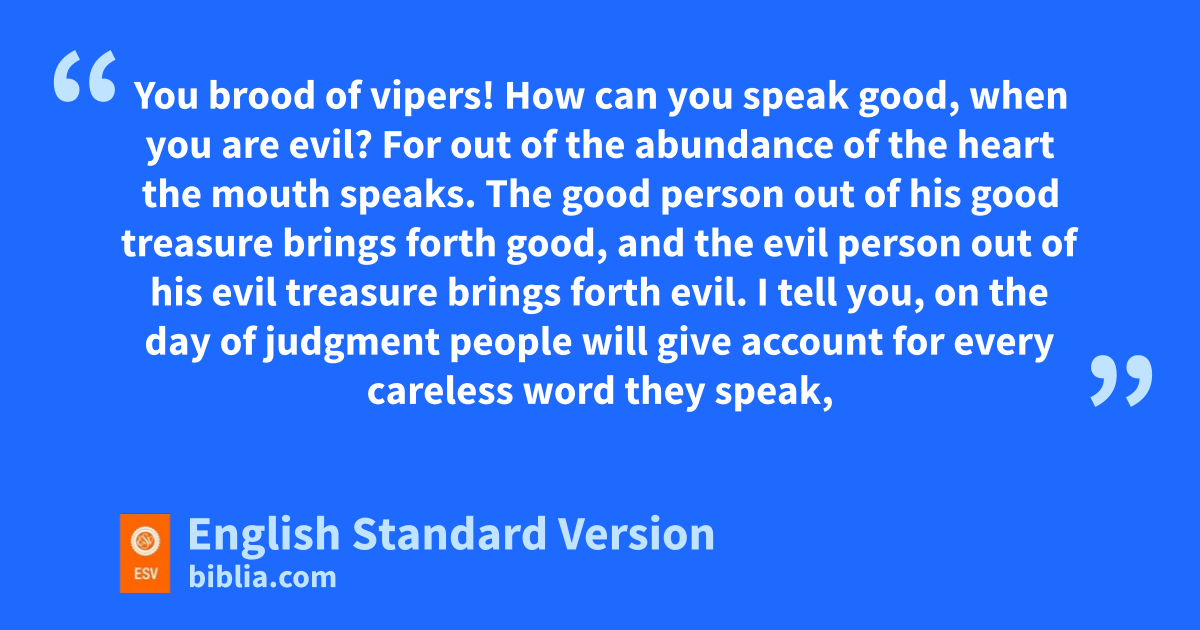 33 n“Either make the tree good and its fruit good, or make the tree bad and its fruit bad, ofor the tree is known by its fruit. 34 pYou brood of vipers! How can you speak good, qwhen you are evil? rFor out of the abundance of the heart the mouth speaks. 35 rThe good person out of his good treasure brings forth good, and the evil person out of his evil treasure brings forth evil. 36 I tell you, son the day of judgment tpeople will give account for uevery careless word they speak, 37 for vby your words you will be justified, and by your words you will be condemned.”