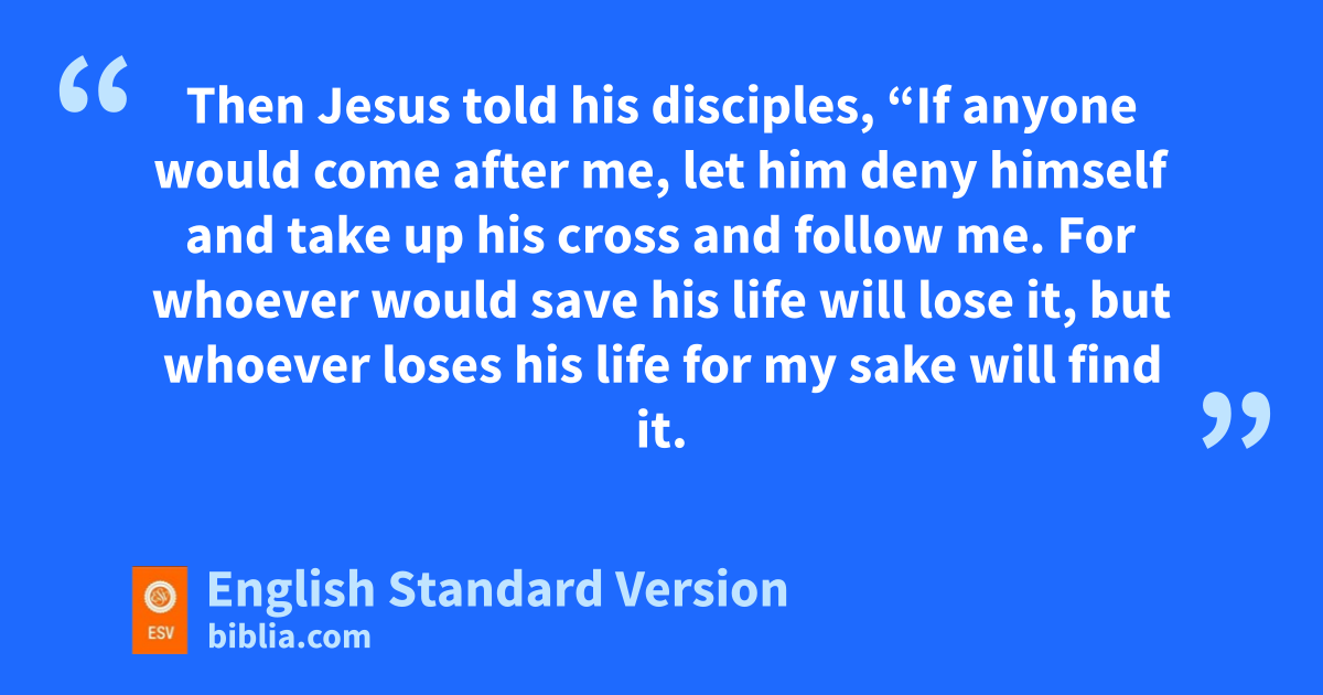 24 Then Jesus told his disciples, “If anyone would come after me, let him wdeny himself and xtake up his cross and follow me. 25 For xwhoever would save his life7 will lose it, but whoever loses his life for my sake will find it. 26 For ywhat will it profit a man if he gains the whole world and forfeits his soul? Or zwhat shall a man give in return for his soul? 27 aFor the Son of Man is going to come with bhis angels in the glory of his Father, and cthen he will repay each person according to what he has done. 28 Truly, I say to you, there are some standing here who will not dtaste death euntil they see the Son of Man fcoming in his kingdom.”