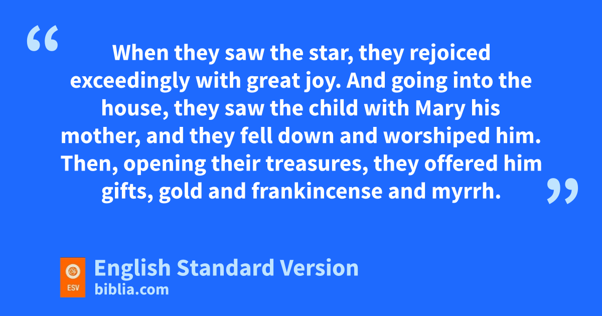 7 Then Herod summoned the wise men secretly and ascertained from them what time the star had appeared. 8 And he sent them to Bethlehem, saying, “Go and search diligently for the child, and when you have found him, bring me word, that I too may come and worship him.” 9 After listening to the king, they went on their way. And behold, the star that they had seen when it rose went before them until it came to rest over the place where the child was. 10 When they saw the star, they rejoiced exceedingly with great joy. 11 And going into the house, they saw the child with Mary his mother, and they fell down and worshiped him. Then, opening their treasures, rthey offered him gifts, sgold and tfrankincense and umyrrh. 12 And vbeing warned win a dream not to return to Herod, they departed to their own country by another way.