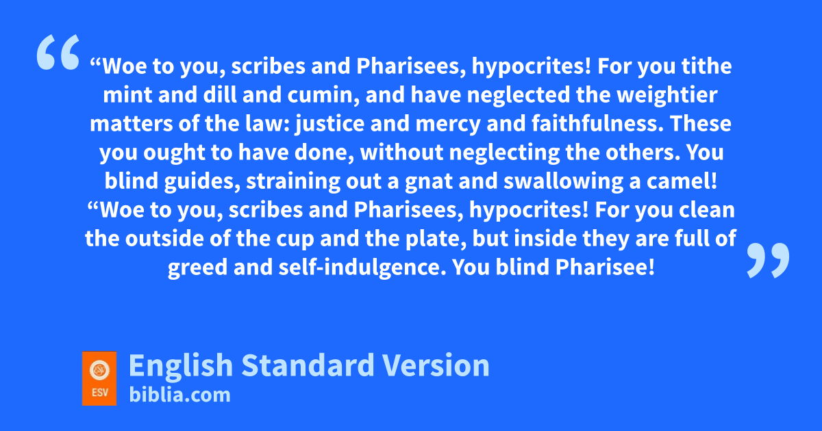 23 d“Woe to you, scribes and Pharisees, hypocrites! For eyou tithe mint and dill and fcumin, and have neglected the weightier matters of the law: gjustice and mercy and faithfulness. hThese you ought to have done, without neglecting the others. 24 You blind guides, straining out a gnat and swallowing ia camel!