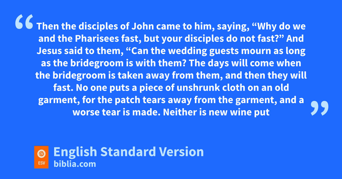 14 Then mthe disciples of John came to him, saying, n“Why do we and othe Pharisees fast,3 but your disciples do not fast?” 15 And Jesus said to them, p“Can the wedding guests mourn as long as the bridegroom is with them? qThe days will come when the bridegroom is taken away from them, and rthen they will fast. 16 No one puts a piece of unshrunk cloth on an old garment, for the patch tears away from the garment, and a worse tear is made. 17 Neither is new wine put into old swineskins. If it is, the skins burst and the wine is spilled and the skins are destroyed. But new wine is put into fresh wineskins, and so both are preserved.”