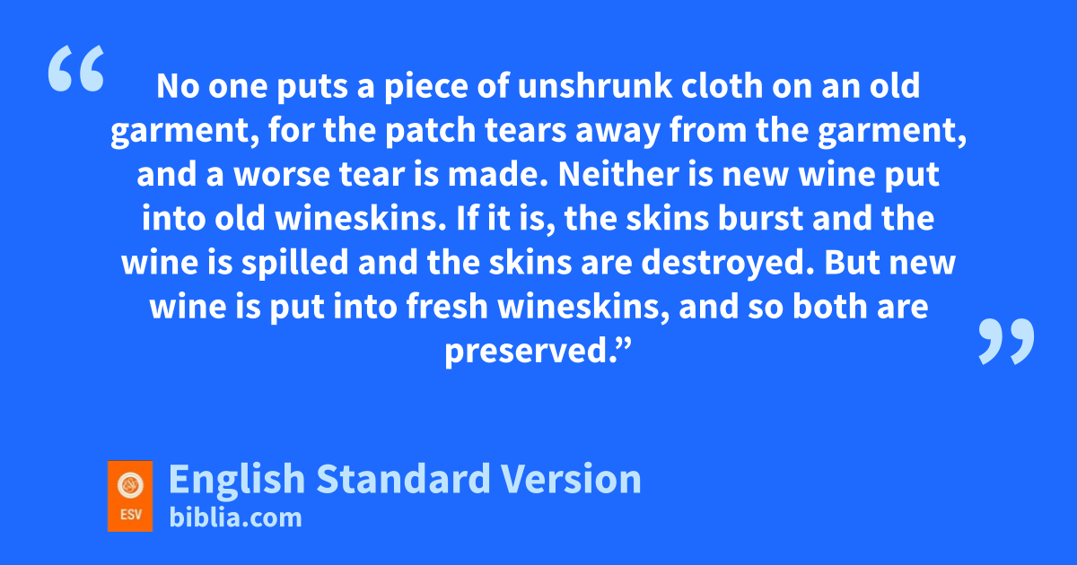 14 Then mthe disciples of John came to him, saying, n“Why do we and othe Pharisees fast,3 but your disciples do not fast?” 15 And Jesus said to them, p“Can the wedding guests mourn as long as the bridegroom is with them? qThe days will come when the bridegroom is taken away from them, and rthen they will fast. 16 No one puts a piece of unshrunk cloth on an old garment, for the patch tears away from the garment, and a worse tear is made. 17 Neither is new wine put into old swineskins. If it is, the skins burst and the wine is spilled and the skins are destroyed. But new wine is put into fresh wineskins, and so both are preserved.”