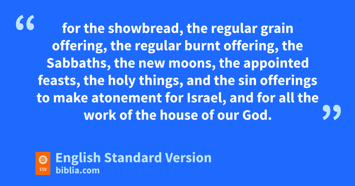 32 “We also take on ourselves the obligation to give yearly ua third part of a shekel3 for the service of the house of our God: 33 vfor the showbread, wthe regular grain offering, wthe regular burnt offering, the Sabbaths, the new moons, the appointed feasts, the holy things, and the sin offerings to make atonement for Israel, and for all the work of the house of our God. 34 xWe, the priests, the Levites, and the people, have likewise cast lots yfor the wood offering, to bring it into the house of our God, according to our fathers’ houses, at times appointed, year by year, to burn on the altar of the Lord our God, zas it is written in the Law. 35 We obligate ourselves ato bring the firstfruits of our ground and the firstfruits of all fruit of every tree, year by year, to the house of the Lord; 36 also to bring to the house of our God, to the priests who minister in the house of our God, the firstborn of our sons and of our cattle, bas it is written in the Law, and the firstborn of our herds and of our flocks; 37 cand to bring the first of our dough, and our contributions, the fruit of every tree, the wine and the oil, to the priests, dto the chambers of the house of our God; and to bring to the Levites the tithes from our ground, for it is the Levites who collect the tithes in all our towns where we labor. 38 And the priest, the son of Aaron, shall be with the Levites when the Levites receive the tithes. And the Levites shall bring up the tithe of the tithes to the house of our God, to the chambers of ethe storehouse. 39 For the people of Israel and the sons of Levi fshall bring the contribution of grain, wine, and oil to the chambers, where the vessels of the sanctuary are, as well as the priests who minister, and the gatekeepers and the singers. gWe will not neglect the house of our God.”