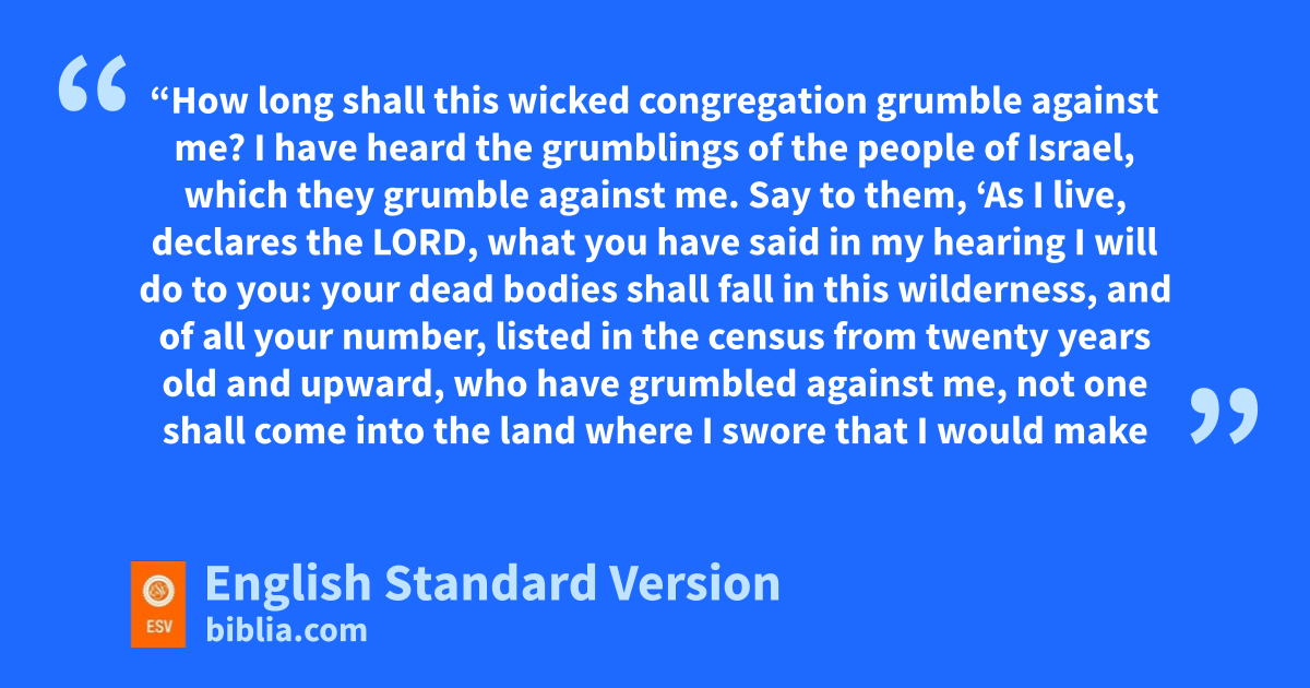26 And the Lord spoke to Moses and to Aaron, saying, 27 “How long shall sthis wicked congregation grumble against me? tI have heard the grumblings of the people of Israel, which they grumble against me. 28 Say to them, u‘As I live, declares the Lord, vwhat you have said in my hearing I will do to you: 29 wyour dead bodies shall fall in this wilderness, and xof all your number, listed in the census yfrom twenty years old and upward, who have grumbled against me, 30 not one shall come into the land where I zswore that I would make you dwell, aexcept Caleb the son of Jephunneh and Joshua the son of Nun. 31 bBut your little ones, who you said would become a prey, I will bring in, and they shall know the land that cyou have rejected. 32 But as for you, wyour dead bodies shall fall in this wilderness. 33 And your children dshall be shepherds in the wilderness eforty years and shall fsuffer for your faithlessness, until the last of your dead bodies lies in the wilderness. 34 gAccording to the number of the days in which you spied out the land, hforty days, a year for each day, you shall bear your iniquity forty years, and you shall know my displeasure.’ 35 iI, the Lord, have spoken. Surely this will I do to all jthis wicked congregation who are gathered together against me: in this wilderness they shall come to a full end, and there they shall die.”
