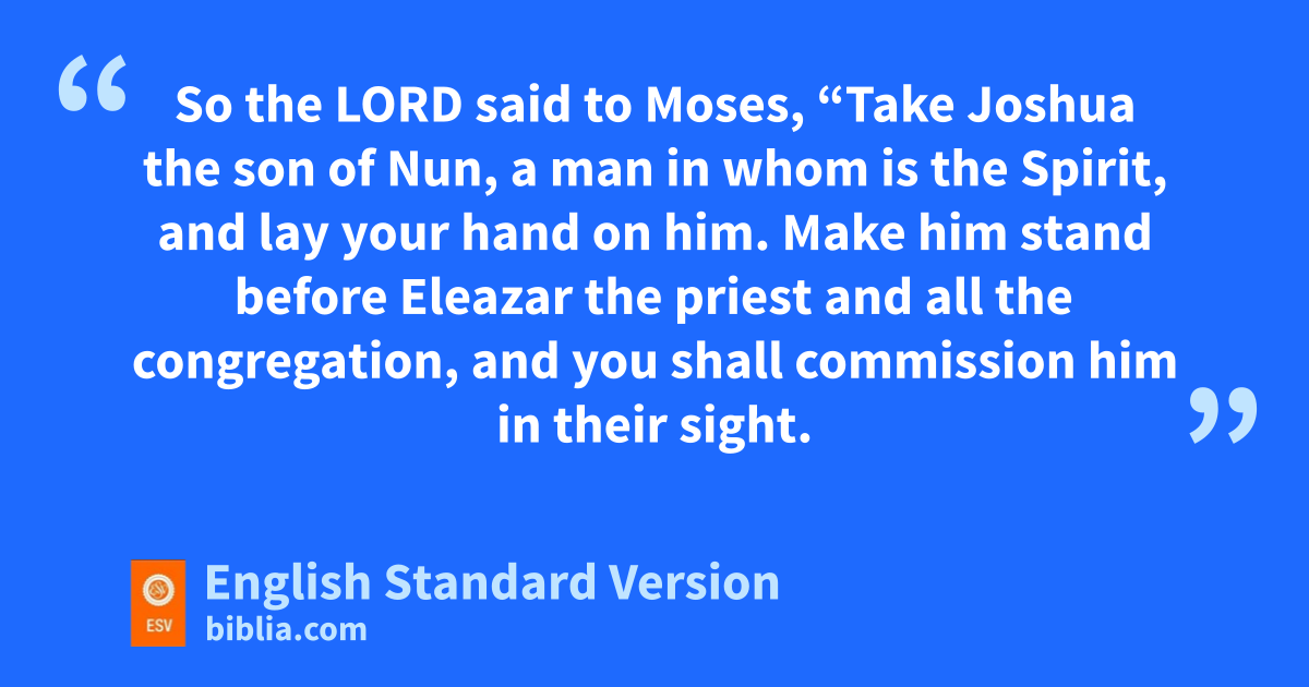 12 The Lord said to Moses, “Go up into hthis mountain of Abarim and see the land that I have given to the people of Israel. 13 When you have seen it, you also ishall be gathered to your people, as your brother Aaron was, 14 jbecause you rebelled against my word in the wilderness of Zin when the congregation quarreled, failing kto uphold me as holy at the waters before their eyes.” (These are lthe waters of Meribah of Kadesh in the wilderness of Zin.) 15 Moses spoke to the Lord, saying, 16 “Let the Lord, mthe God of the spirits of all flesh, appoint a man over the congregation 17 who nshall go out before them and come in before them, who shall lead them out and bring them in, that the congregation of the Lord may not be oas sheep that have no shepherd.” 18 So the Lord said to Moses, “Take pJoshua the son of Nun, a man qin whom is the Spirit, and rlay your hand on him. 19 Make him stand before Eleazar the priest and all the congregation, and you shall scommission him in their sight. 20 You shall invest him with some of your authority, tthat all the congregation of the people of Israel may obey. 21 And he shall stand before Eleazar the priest, who shall inquire for him uby the judgment of the Urim before the Lord. At his word they shall go out, and at his word they shall come in, both he and all the people of Israel with him, the whole congregation.” 22 And Moses did as the Lord commanded him. He took Joshua and made him stand before Eleazar the priest and the whole congregation, 23 and he laid his hands on him and scommissioned him as the Lord directed through Moses.